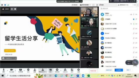 接着,中加班出国生代表18级唐睿就在滑铁卢大学的学习生活、申请研究生的经历与经验分享进行了详细的介绍,并建议同学们以长远视角理性规划个人学习与职业生涯。随后,中加班出国生代表19级王小洁就个人选择出国的原因、国外学习的课程安排特色和出国后的衣食住行方面进行了细致的分享,并且提出留学生活会极大地开阔个人视野、真实经历多元文化、获得独立思考的能力。