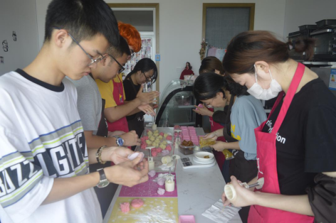 11日中午,学院2017级和2018级学生代表来到仙林九霄梦天地,在专业老师的指导下,细心为正在军训的学院2019级新生制做月饼。在完成和冰皮粉、揉团、调馅、包馅和揉圆压扁的一系列步骤后,同学们用模具将不同颜色的面团压成不同图案的月饼形状,这样,一个个寄托着学长学姐真诚祝福的月饼便成功出炉了。