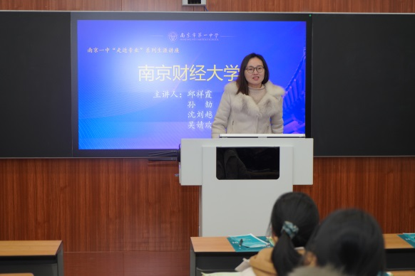 的特色专业和经济学的“前世今生”,并以亚当·斯密在《国富论》中得到的著名观察结果—“看不见的手”引发学生们对于经济学的深入思考。孙劼老师作了题为“如何理解国际经济关系?”的主题讲座。孙老师从一则明代故事出发,启发同学们自主展开头脑风暴,让同学们尝试用自己从学校或生活中所学到的知识,来思考和理解国际经济关系的产生与发展,进而形成一种从国家与私人两类主体、三层关系的角度来看待国际经济关系的思维框架。分享交流环节,南京一中毕业生代表沈严和沈刘越两位同学以“我眼中的磁力链