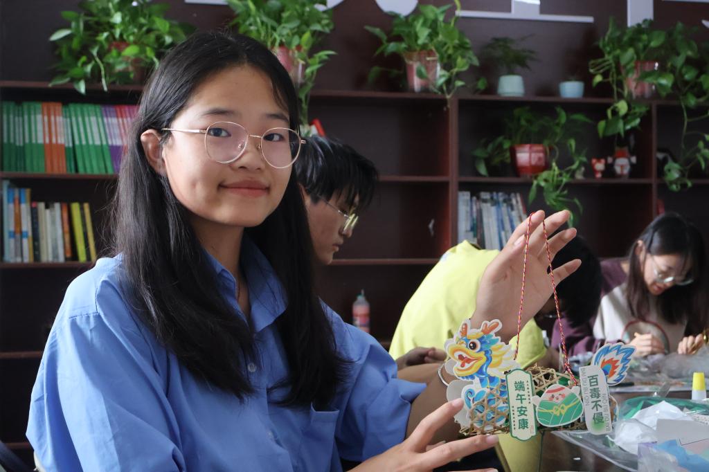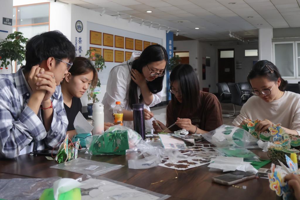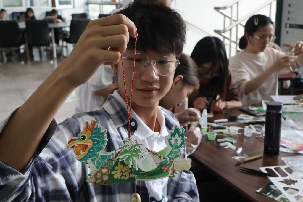 活动伊始,老师为同学们提前准备了充足的材料,供同学们自由挑选和使用。大家手拿彩绳环绕着竹编网,双手翻转挽成龙舟主体,剪刀飞舞裁剪龙头龙尾的彩色卡纸,将其粘在主体两端,并用金线系上铃铛与流苏,最后为龙舟挂上写有“端午安康”等祝福语的卡片,以表避邪驱瘟、迎祥纳福之意。当同学们轻轻提起自己亲手制作的龙舟挂件,微风吹拂下金铃清脆作响,现场不时传来阵阵欢声笑语,气氛温馨而和谐。