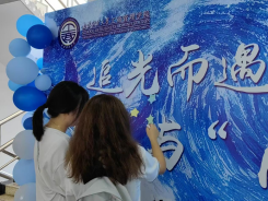 办理完宿舍相关手续后,新生们前往德济楼四楼大厅进行报到注册。走出四楼电梯口,首先映入眼帘的是“激扬青春 逐光而行”磁力链