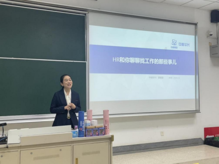 校友郭婧蓉从一名有着深厚的专业素养和丰富的实践经验的HR的视角对同学们进行就业指导。她通过解析本科生与研究生两个阶段的择业情况,并结合人力资源管理专业特点与优势,用幽默风趣的语言为在场同学提供了求职建议。其中,她着重介绍了面试的相关技巧,希望能够帮助同学们在日后的求职过程中更加轻松地应对不同的面试形式。此外,她还设置了一些问题,同学们踊跃回答,领取了各种精美的礼品。