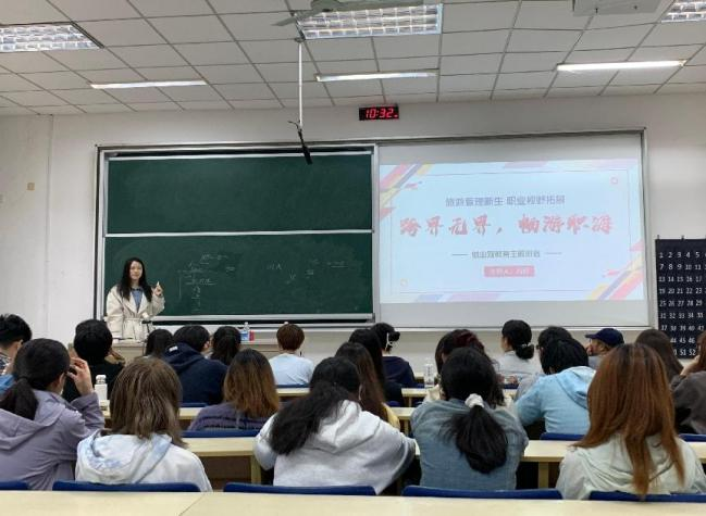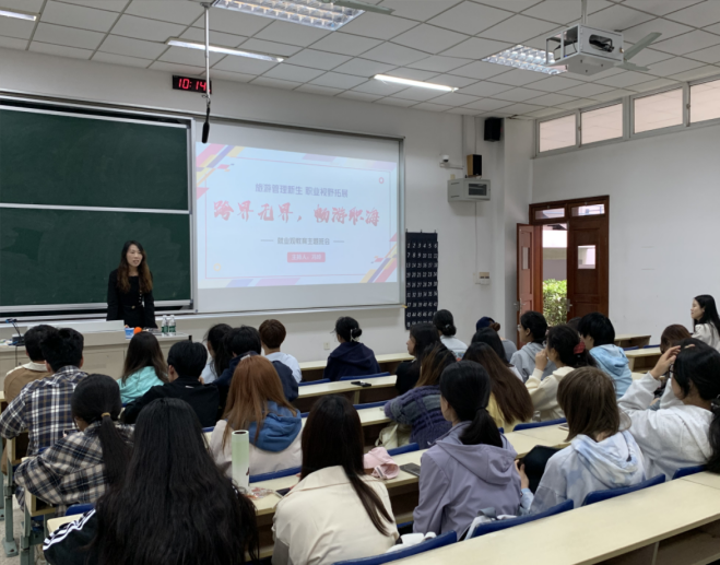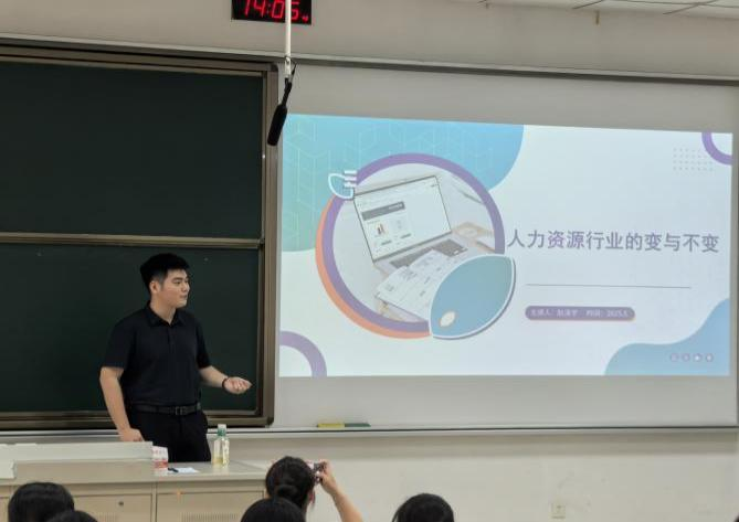 旅游管理专业毕业生刘芳分享打破了传统“导游/酒店”就业认知,向旅游2401班的同学展示了“大文旅产业”的多元机会,包括文旅策划、OTA运营、会展经济、研学旅行等新兴领域,助力学生从游客视角转向行业视角,早做职业准备;人力资源管理专业毕业生赵泽宇以“人资的变与不变”为主题,结合自身丰富的海外求学经历和国企实习经历展开分享,从“为什么选择人力资源管理专业”这一问题切入,为同学们深入剖析人力资源管理专业的魅力与发展前景; 邬志浩则聚焦于人力资源管理的学习与就业经验,着重强调了实践能力提升、明确职业规划以及保持积极心态的重要性;工商管理专业毕业生王涛以“解码工商管理的职业可能性”为主题,结合自身创业和工作的经历,帮助工商管理专业大一学生树立科学的就业观并提前规划职业路径。