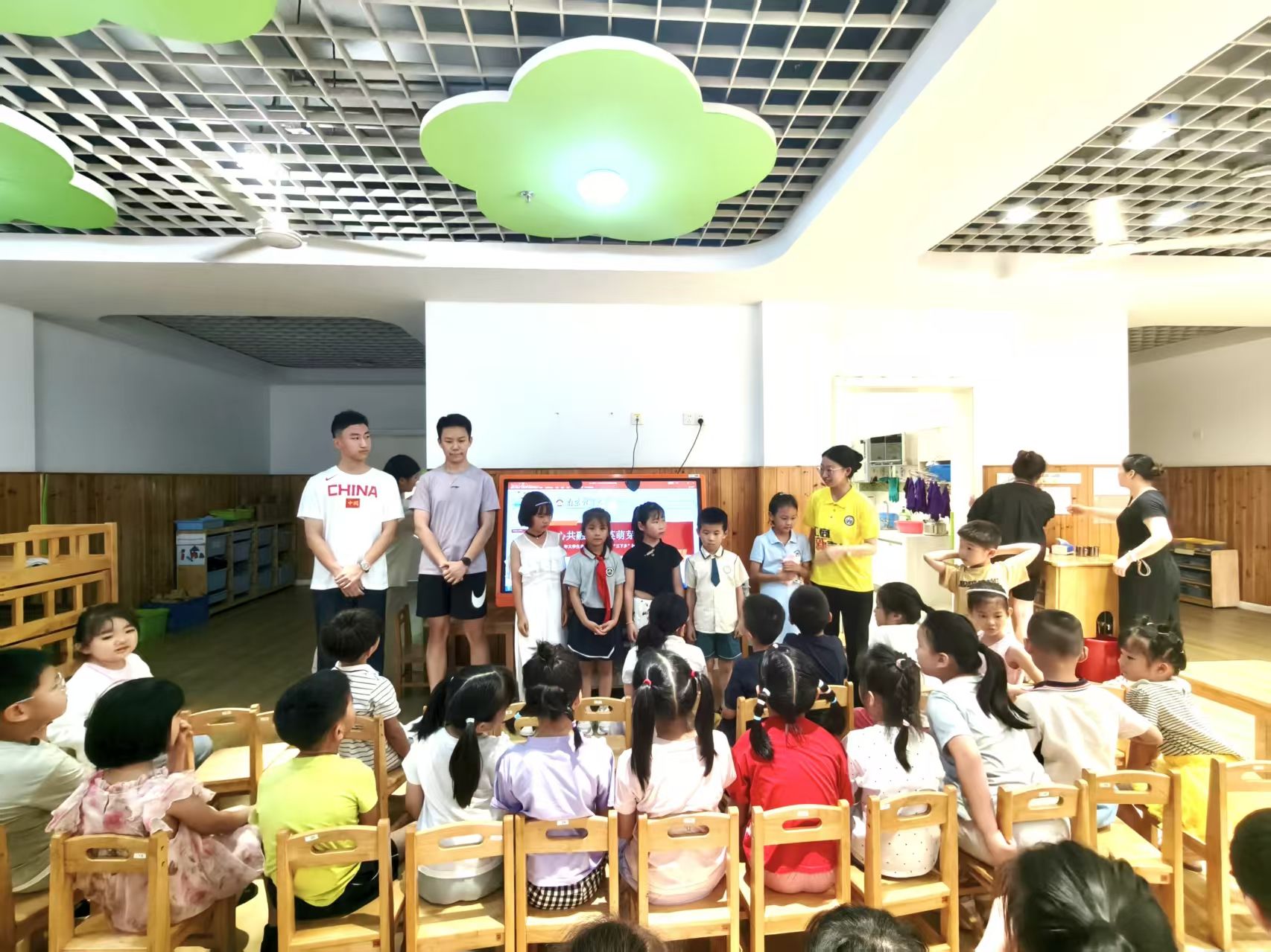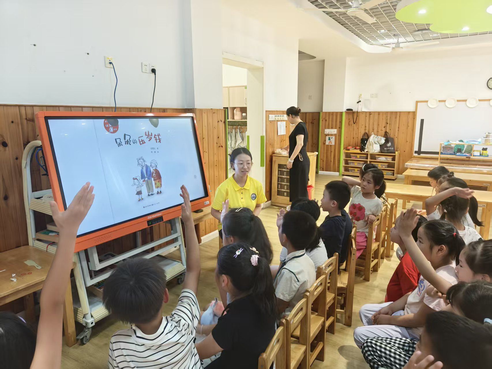 图为大学生志愿者讲绘本《朵朵的压岁钱》