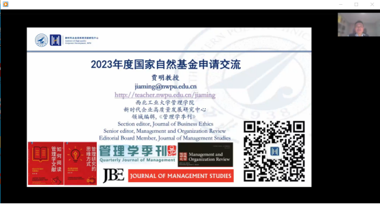 邀请,西北工业大学管理学院副院长贾明教授为学院全体师生带来一场主题为“2023年度国家自然基金申报交流”的线上学术讲座。讲座由磁力链