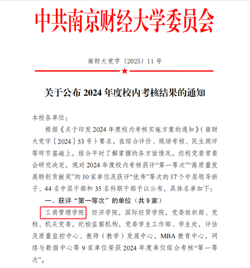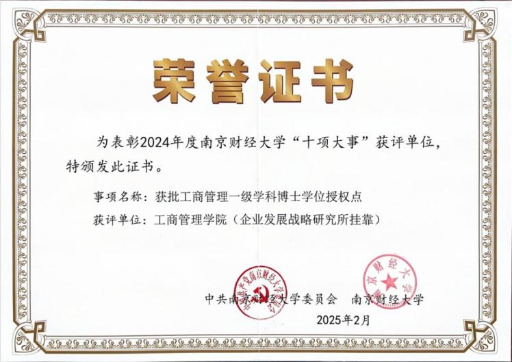 牵头申报的工商管理一级学科博士学位授予点成功获批入选学校“十项大事”,学院荣获2024年度教学院(部)综合考核第一等次第一名。程永波校长为2024年度“十项大事”获评单位颁发荣誉证书,张利民书记为2024年度考核获评“第一等次”单位颁奖,磁力链