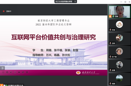 首先,秦伟平教授说明了答辩流程和要求;接着,磁力链 本科论文团队项目的队长周珊同学从选题依据、团队合作、研究思路、主要结论与创新点五个方面进行详细汇报。周珊、张千禧、张慧与彭露四位同学合作研究的论文方向为互联网平台价值共创与治理研究,探究在平台、企业、消费者等主体共存的生态系统中,如何有效实现数据赋能与价值共创、如何应对消费者行为、如何实现企业绩效与平台治理共赢等问题。