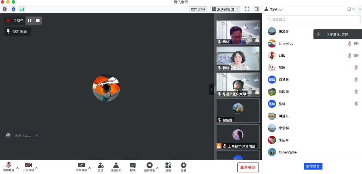 的张郑熠老师、文婷老师、盛海潇老师介绍了创新创业课程建设方面的经验,徐祖辉老师介绍了创新创业论文的发表经验,重庆市蔚兰环保科技有限公司负责人廖子杰介绍了蔚兰环保的创业历程,与会的其他老师也参与了讨论;最后,蒋琰教授做了会议总结。