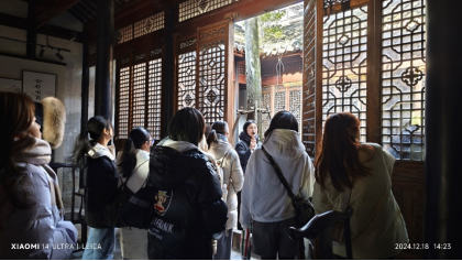 佘村位于江宁区东山街道,已有600余年历史,是江苏省首批省级传统村落之一。佘村以其独特的徽派建筑风格和宁静的田园风光著称,是一个理想的旅游目的地。这座村庄不仅仅有"古风",城市时尚的休闲方式也已融入其中,民宿、咖啡馆、面包房,一切那么和谐。实地考察过程中,村内解说员对佘村的村史、建筑遗产、非物质文化遗产等进行了讲解;带领大家参观了网红民宿、咖啡馆、稻田;并且对佘村的运营模式进行了介绍。师生们以社交媒体时代、“全民围观”时代为背景,从传播理论视角,解读了佘村的营销爆点以及其旅游目的地形象,总结了从“流量”到“留量”,佘村做了什么。师生们进一步积极交流讨论了佘村乡村咖啡馆的特色、面临的挑战和机遇、并对其未来发展提出建议。