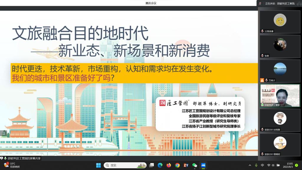 邀请,江苏匠工营国规划设计有限公司总经理、江苏省产业教授邵颖萍通过腾讯会议作了题为“文旅融合目的地时代:新业态、新场景和新消费”的讲座。讲座由磁力链