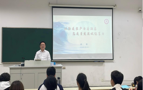 讲座伊始,胡俊副总经理分享了个人发展经历,分析了旅游管理专业的就业方向与就业前景。讲座围绕“为什么提出新质生产力”“什么是新质生产力”“酒店如何培育和发展新质生产力”三个问题展开。胡俊副总经理分别从历史逻辑、理论逻辑和实践逻辑三个角度阐释了提出新质生产力的原因。他通过热点案例和直观的市场数据,提出酒店行业要以品牌力为要,以数字力为基,以创新力为本,打造“新服务”“新价值”“新自我”。胡俊副总经理希望同学们能够立足底层逻辑,将科技力量与人文关怀交织,将传统资源与现代创新碰撞,为我国的旅游业发展贡献一份力量。